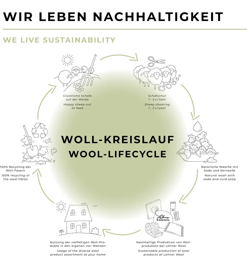 Lehner Wool ist Spezialist für 100 % Schafschurwolle und verfügt über langjährige Expertise in der rein mechanischen Verarbeitung dieses vielseitigen Naturmaterials. Mit einem tiefen Verständnis für die besonderen Eigenschaften der Wolle entstehen innovative Produkte, die funktional, nachhaltig und ressourcenschonend sind. Ziel ist es, ökologische Verantwortung sichtbar zu machen und den bewussten Einsatz nachwachsender Rohstoffe aktiv zu fördern.