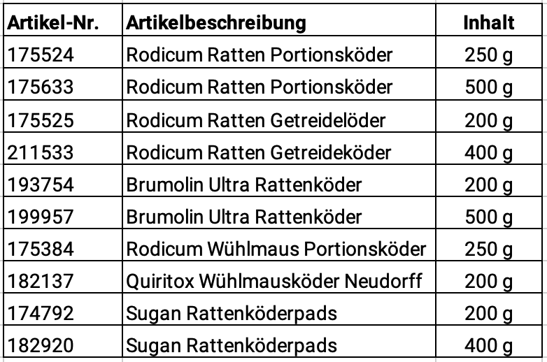 Ab 1. April 2026 müssen somit Nagerköder mit dem Wirkstoff Coumatetralyl aus dem Verkauf genommen und auf Sperrlager gelegt werden. Sie haben die Möglichkeit folgende Artikel in Ihrer GBC Österreich-Filiale zu retournieren:
